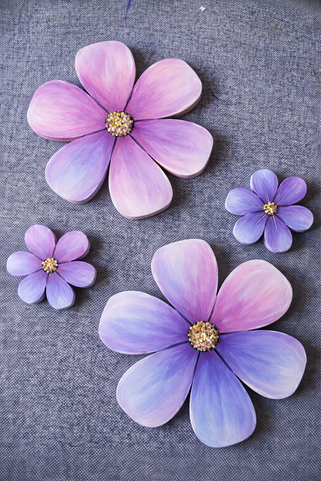The process is quiet and repetitive in the best way — sanding, painting, layering colour, letting things dry, then coming back again. There’s no rush. Each flower takes the time it needs.